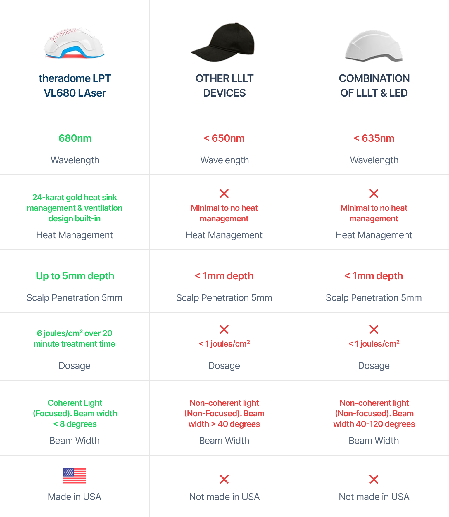 Theradome employs the latest hair regrowth technology and is FDA-cleared for safe, effective at-home use.